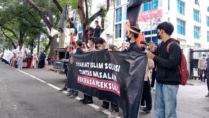 Medan - Sejumlah mahasiswa menggelar demonstrasi di depan kantor DPRD Sumut. Mereka meminta Permendikbudristek Nomor 30 tentang Pencegahan dan Penanganan Kekerasan Seksual (PPKS) di Lingkungan Perguruan Tinggi dicabut.